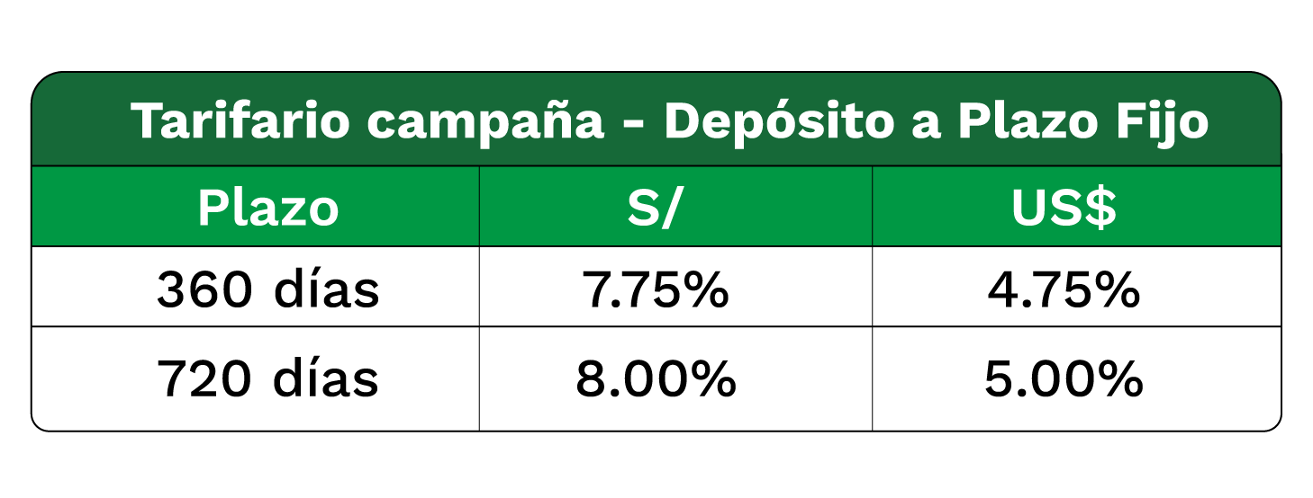 Depósito a Plazo Fijo (DPF). Condiciones Generales y restricciones: Campaña válida del 31/10/2025 al 30/11/2025. Monto mínimo de apertura desde S/ 50,000.00 soles (cincuenta mil con 00/100 soles) o US$ 10,000.00 (diez mil con 00/100 dólares de EUA). En caso de depósitos en soles, cuando el depósito es de S/ 50,000.00 a 360 días con una TEA de 7.75% será un total de S/ 53,875.00. En caso de depósitos en dólares, cuando el depósito sea de US$ 10,000.00 a 360 días con una TEA de 4.75% será un total de US$ 10,475.00. Válido para persona natural. Solo para fondos nuevos. En caso de cancelación anticipada se remunerará a tasa de ahorro vigente. Los importes con los que abran los Depósitos a Plazo Fijo corresponden a recursos, dinero o fondos nuevos que se abonen a través de las cuentas corrientes o cuentas de ahorro que Abaco mantiene en el sistema financiero o abonos en efectivo en las ventanillas de las tiendas o agencias que Abaco pone a disposición de sus socios, así como, por canales digitales. Para más información puede revisar nuestras tasas vigentes en www.abaco.com.pe.